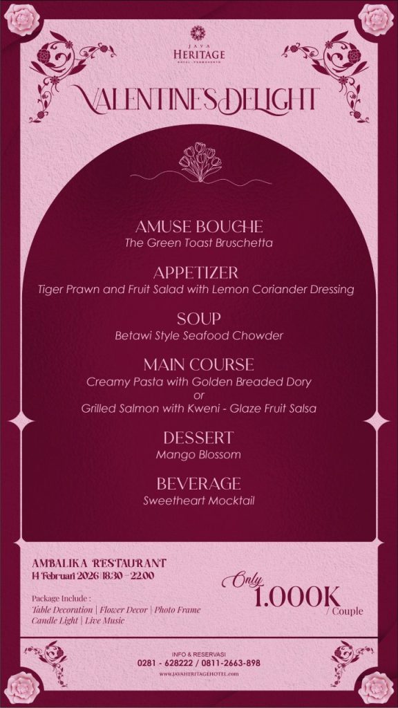 Valentine adalah tentang momen yang diluangkan, percakapan yang mengalir perlahan, dan perhatian kecil yang terasa berarti. Ia menjadi pengingat untuk sejenak berhenti, memberi ruang bagi rasa, dan merayakan kasih sayang yang tumbuh dari perjalanan bersama. Pada 14 Februari 2026, Java Heritage Hotel menghadirkan Valentine’s Delight, sebuah pengalaman romantic dinner yang dirancang khusus untuk merayakan cinta dalam suasana yang hangat, intim, dan penuh keanggunan.